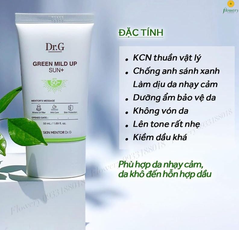 Kem Chống Nắng Dr.G Green Mild Up Sun+ SPF50+ PA++++ 50ml là kem chống nắng thuần vật lý cho da nhạy cảm. Công thức không bết dính lướt nhẹ mà không để lại bất kỳ vết trắng nào. Pycnogenol chiết xuất từ cây thông hoạt động với glycophore và panthenol bảo vệ da khỏi các tác nhân bên ngoài như khói bụi.